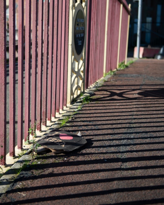 With the idea of ‘similar, but not identical’, I made this photograph by taping two pieces of 35mm film to my phone screen The black and white film was overlaid on the colour and its sprocket holes deliberately mis-aligned to achieve the asymmetry. The text along the edge helps explain what the subject is. I like this photograph, because the viewer is looking along the off-horizontal lines that lead to the edges of the frame, but can quickly establish what the subject is by reading the text.
