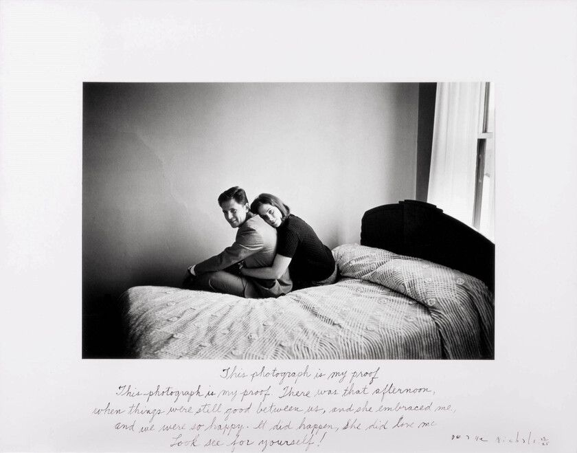 Michals presents us with a photograph of a couple in embrace, sat on bed and obviously posing for the camera. This then is a self-portrait similar to the sort that we see everywhere with the advent of ‘the selfie’. There is clear affection in the way the couple are connected in the image, but the accompanying text seeks to steer us to a situation; the affection that was once there but no longer. In this sense, the text has a feeling of ‘anchor’ about it; directing the viewer to a certain conclusion. However, the text also offers something more broad than the instant conclusion that we may have already reached: