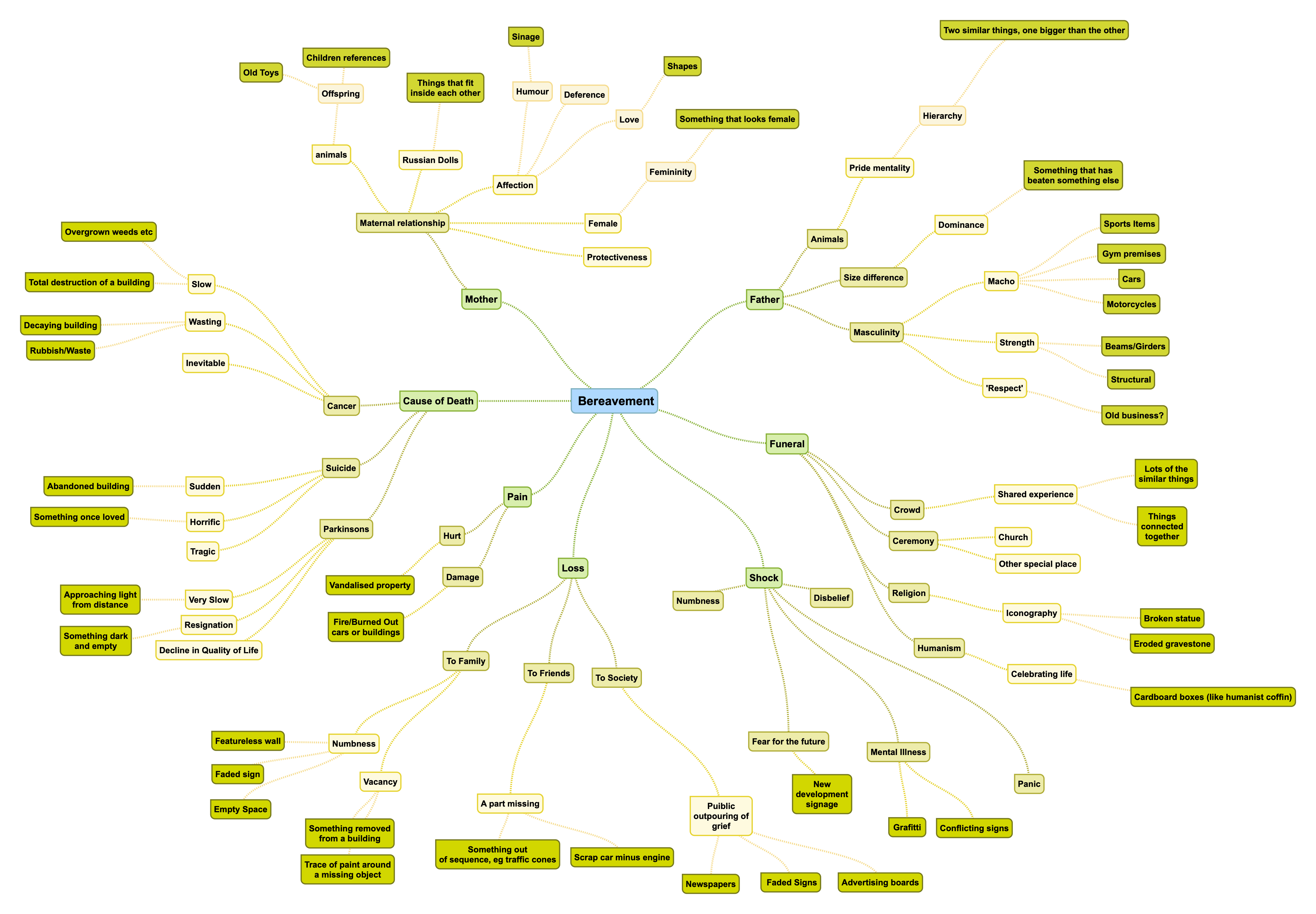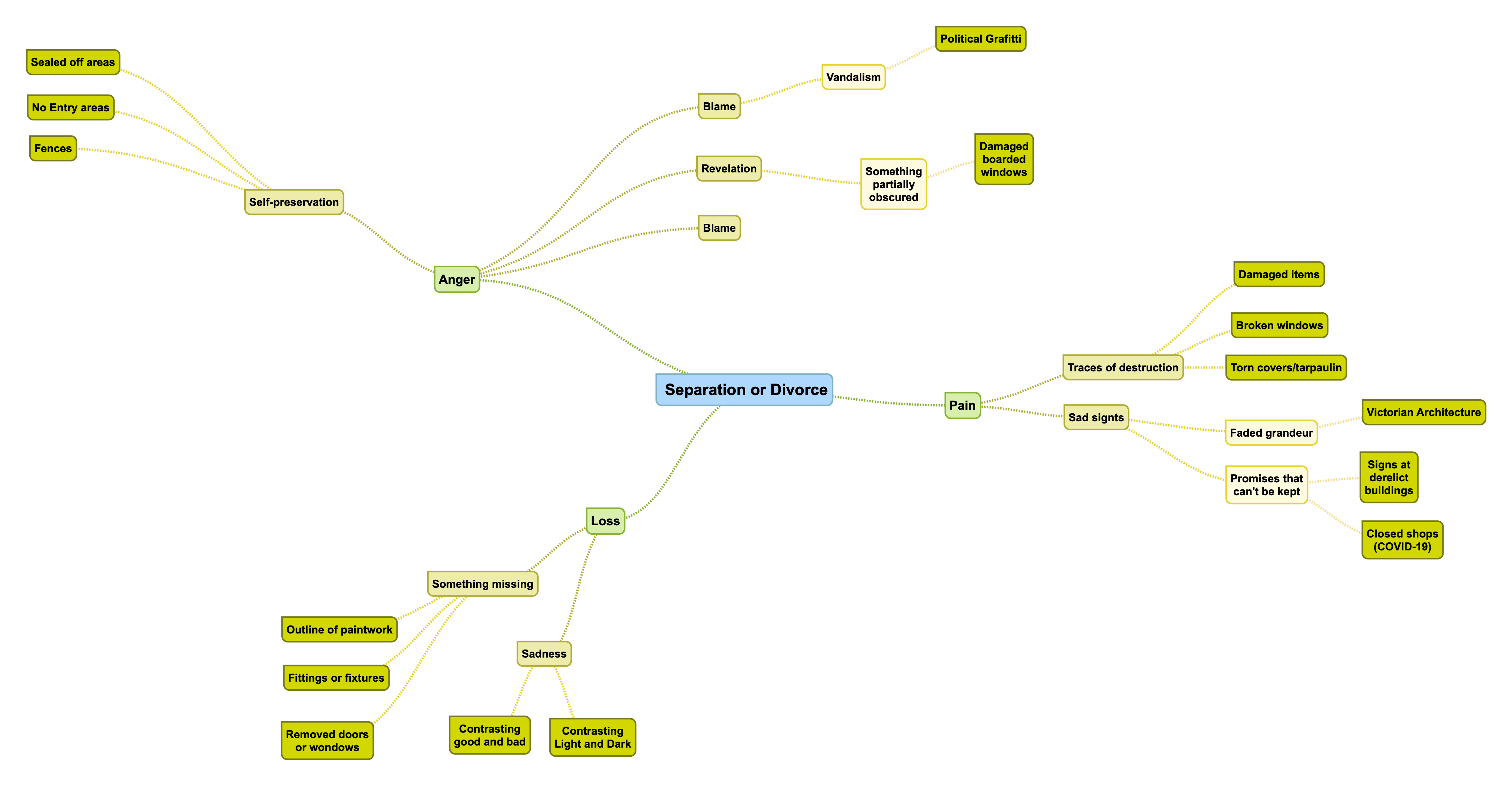 I started to consider how I would photograph subjects that documented the thoughts of the people I had spoken to. It was at this point that I realised that I had lost sight of what the unseen element in this story is. Indeed the thoughts were random and unseen, probably not ever discussed with anyone before I had asked for them. However, they were a response to something terrible happening in the lives of the people concerned. It is actually the trauma and the response that make up the unseen that I needed to document. This was a serious turning point for me during this assignment for reasons that I will discuss later. For now, I had to find subjects that suggested the trauma being experienced and marry the words to the photographs to help support the narrative. This required returning to the beginning and thinking carefully about metaphors for trauma. I created the mind-maps below to help steer the project, which I found to be useful in what was becoming an increasingly difficult challenge. Based on the types of traumas that my friends suffered, I created maps for Bereavement, Illness/Injury and Separation/Divorce to cover them all. The maps show my thought processes and ideas for subjects to shoot as metaphors for aspects of the trauma rather than just describing the event itself. These were ideas that I took forward into shooting.