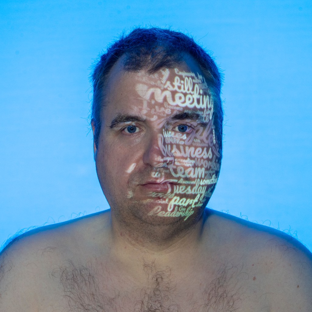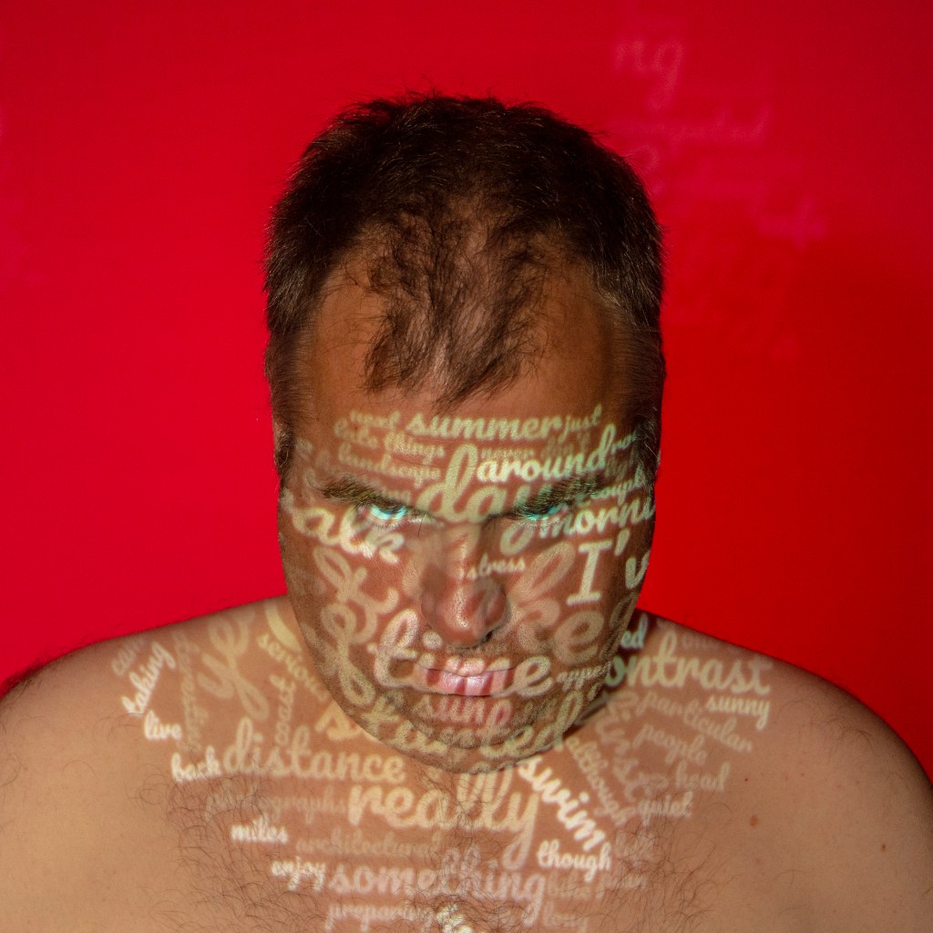 My idea was to take the text from each day of the diary and run them through a software tool to count the most frequently used words produce a word cloud of the most used words. The words are subsequently sized by their frequency, with the higher counts being the larger font size. This crude analysis of the diary produced an impassive assessment of my writing, which often contrasted with the original intent. I wanted to highlight these differences by projecting the words onto my expressionless face. I would further add to the contrast by lighting the background of the portraits with colours that represent or invoke emotional responses both in me and in the viewer. It would be up to the viewer as to how they interpreted the image in terms of narrative. Arranging a week’s worth of portraits would present the linear passing of time through the series. During the preparation work, I had decided to stop developing the idea so that I could shoot it. However, during further reflection I realised that the viewer would actually have to read the whole diary in order to appreciate the series. I felt that this would significantly lessen the impact of the images, so decided to include short paragraphs of the respective days alongside them. Each image would now be captioned, which I felt would make the series stronger.