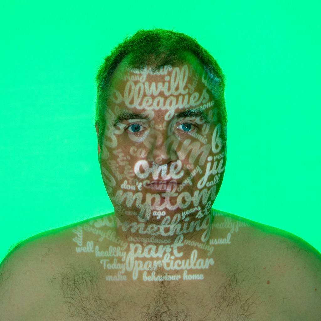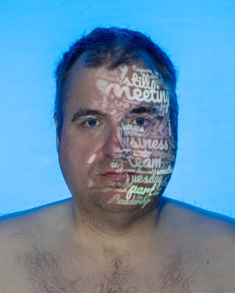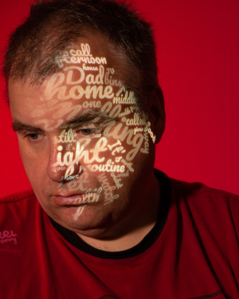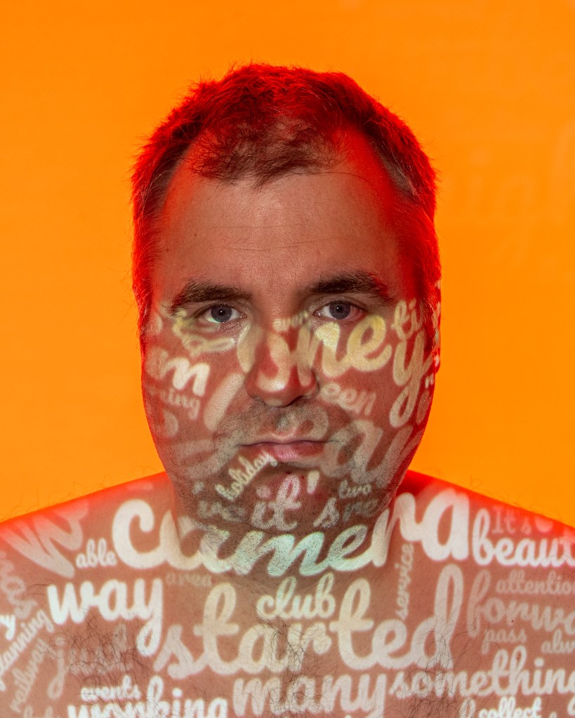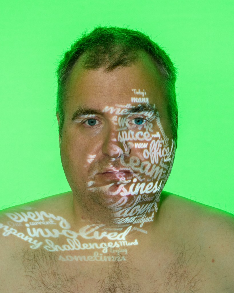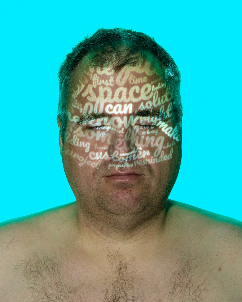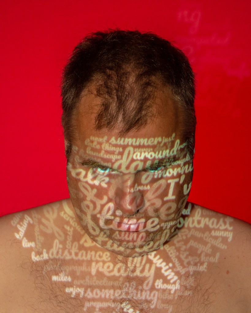 I set up a small studio with a plain grey background and a studio strobe fitted with different coloured gels. The camera, key light (the projector) and fill light (continuous LED) were positioned on stands and the camera on a tripod. I enlisted my wife to set the final position of the words onto my skin and operate the camera. Each portrait was then further post-processed and had the text added to it.
