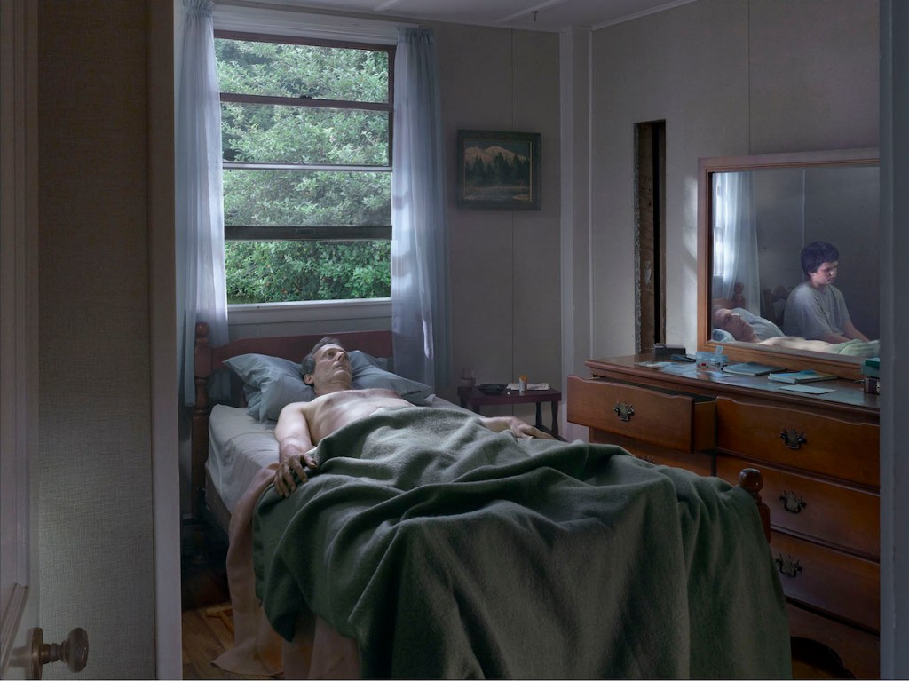 Here we have a scene of a man lying in bed in a pose that suggests that he is either dying or has recently passed away. A soft, ethereal light streams through the open window at the head of the bed and illuminates the man’s pale skin with very little contrast between highlight and shadow. We see a reflection of a boy sitting by the man’s bedside in the mirror but cannot physically see him as he is obscured by a partial wall on the left of the frame. The expression on the boy’s face is one of sadness akin to that of a visitor to a hospital bedside or a mourner. This image is a classic Crewdson tableau with a mixture of natural and artificial light and a carefully constructed set. Every detail within the space is lit in a way that draws the eye around the composition looking for meanings. For example, Why is the dresser drawer partially open? Why is there no physical connection between the two subjects? Is the man posed as if lying in state, i.e. has he already died and is this the calm aftermath we are witnessing. There is no escaping the emotional feel of the photograph.