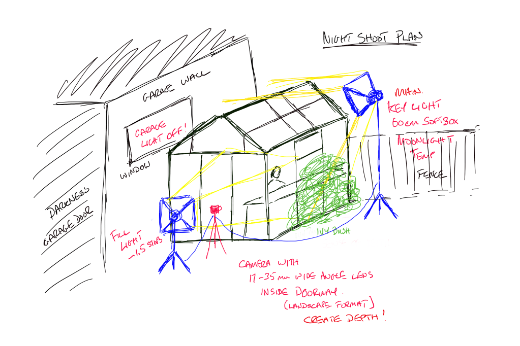 Shoot sketch showing the lighting arrangement, camera position etc.