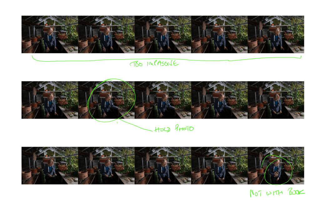 “My thought is that Jayne is sitting in a greenhouse because it was once the happy place for her Father (or Grandfather) and that he has died, possibly some time ago. She is looking at photos of him and his garden as that was his great love and she is missing him so wants to be where they spent time together and she can feel close to him. It feels like it could be the anniversary of his death or his birthday, or he was perhaps ill for a while and neglected the greenhouse for some time.”