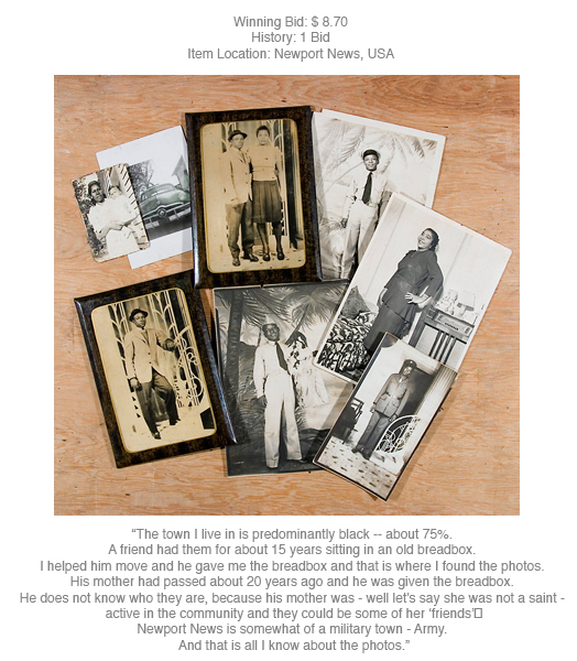 This is an interesting question. In the first instance there is evidence that the individual photographs had an increased monetary value as a result of being in Bird’s series. The video clip on the artist’s website [3] shows a picture with its accompanying ‘title’ selling for £12, which we assume is considerably more than the bare minimum that it was originally purchased for. Being introduced to the public as an artwork and gaining more exposure than it had ever had in the lifetime of the owner [3], the interest in the photograph had grown many times over. That value is more interesting than the financial for me. In seeing the photographs together at a gallery, the viewer is being presented with them as art that has been created by an artist as I mentioned previously. The value may have something to do with that simple fact and Bird’s reputation as an artist and photographer, but for me there is more to it than that. When we see these images, we see the lost history that interested Bird in the first place and because everyone has imagery of some sort that documents their own lives, we emotionally relate to that. The fact that Bird came to the rescue of these uniquely personal documents, saving them from destruction appeals to our own sense of place in the world. The sentimental connection with the past and the narratives that we write for the pictures as we see them, creates value to the piece. The mastery of the work is in the way that it started and ended with an auction, the re-situated archive that Bird created becoming transient [4]. For me, it serves as both an artwork and social reminder that our lives are so brief in the context of history, that some things are worth preserving in some way for the next person to appreciate. The irony of the sale is that not only is the archive transient, but it also becomes disbanded with the images going to a whole variety of new owners.