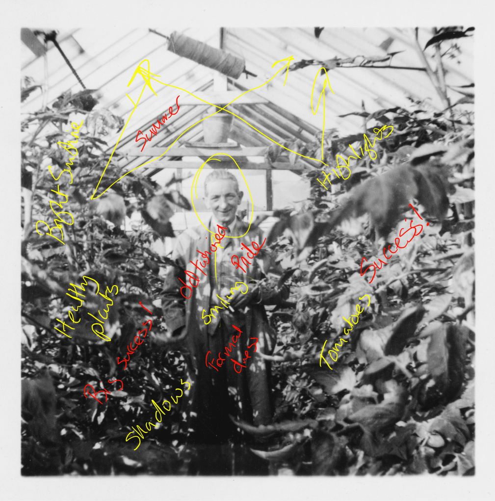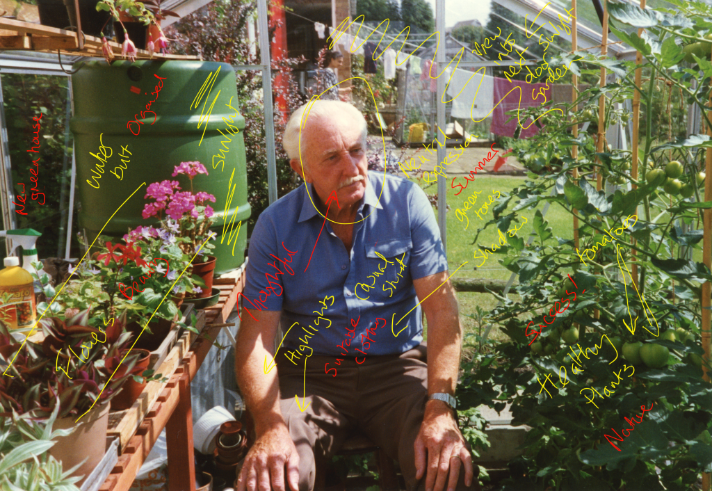This immediately got my attention. The main picture is of Bryan sitting in his greenhouse in the mid-1980s. He had just retired from teaching after a long and successful career and was indulging one of his passions that he hadn’t had time to do when he was working. What interested me was that Bryan had tucked a smaller photograph of his father in a similar situation into the same sleeve. Bryan had seemingly found the older print and related to its similarities to his own photo, electing to store them together. There was something deeply significant about this act as the album isn’t viewed often these days so the connection between the two photographs could be thought of as everlasting in some way. The actual similarities between the images in terms of composition and context were also striking – to explore this further, I deconstructed both images as I did in Exercise 3 and Assignment 4.