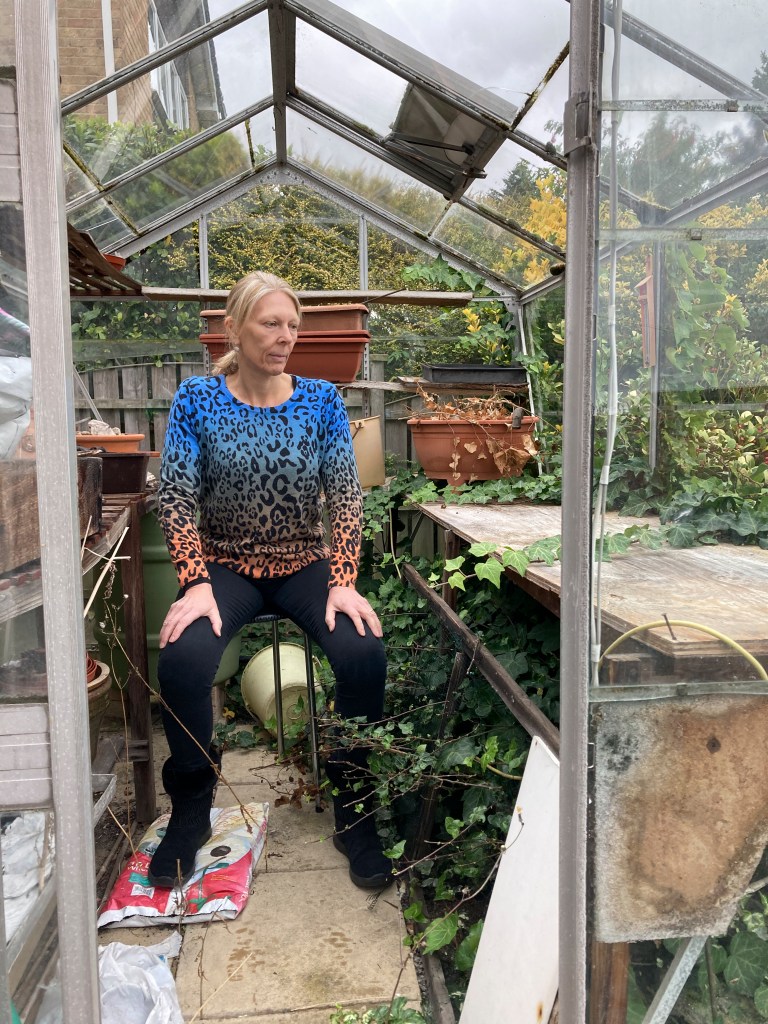 I took the following pictures to experiment with perspective – which angle and how much of the greenhouse would I include? I put Jayne in a similar position in the space as Bryan in his photograph. At this stage, this was just for a reference as I hadn’t yet decided on what to do with Jayne in my composition.