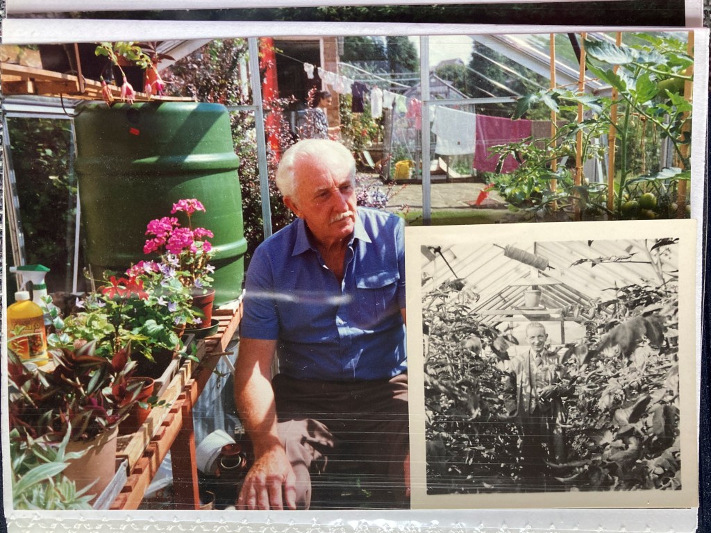 From the two images I could see some common elements. Both men are were the centre of the greenhouses and also the composition. They were both surrounded by the fruits of their labours, which were very healthy looking tomato plants. The photographs were both taken on sunny days with light streaming through the roof of the greenhouses. Both men were wearing the clothes of their era, Johnny in a formal three piece suit and Bryan in 1980s-casual wear. At first they seem at odds with each other, but from what I know of Johnny, he was a smartly-dressed man. So, while he may not have been necessarily dressed for working in the greenhouse as Bryan is, the picture feels spontaneous as if he is showing off what he’d grown.