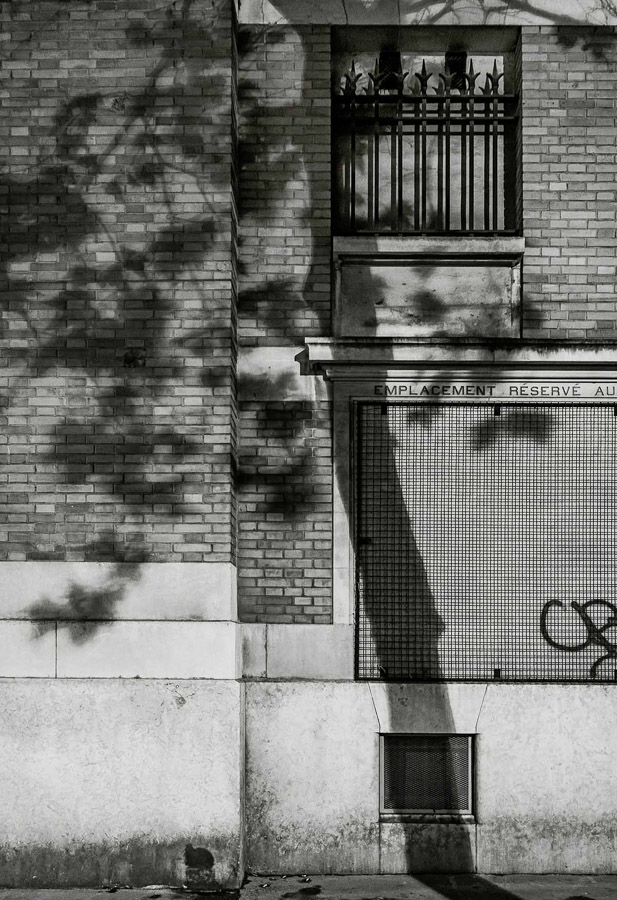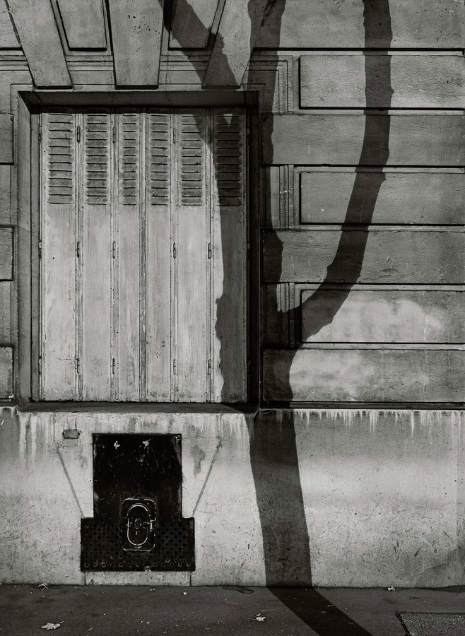 In these photographs we see two portrait compositions of walls that have tree shadows cast onto them. These are part of a collection of 11 photographs that are grouped by a number of typological elements to them. They are all the same format, black and white and shot in bright sunlight to achieve the shadow. Each picture is of a Parisian wall, so they are all cityscapes and each image has texture made up of squares or rectangles; brickwork and stonework feature but so do doorways and windows. The tree shadow runs from the top to bottom of the frame and each is placed almost anchored to a vertical line or feature on the wall behind it. What struck me about the images as a collection was how at first glance they all look very similar as with Water Towers, but after a while the subtle differences between the trees themselves become apparent. Some of the trees are with foliage and some without. Some have multiple branches and some are solitary. This series, like the Bechers’ work, is anchored by multiple references, which make sense but invite more investigation of the subject that is the central player in each picture. We can see a group of tree shadows but we can also see a variety of locations that they are set in. Each Parisian wall is different but has the rigours of the wear of a city on them. Some walls are dirty, some windows need repair and there is evidence of maintenance work being done in one of them. One even has graffiti, which instead of drawing the viewer’s attention from the tree shadow, further emphasises its place in the scene. The images contrast the natural with the manmade in a way that could suggest the former is becoming less impactful on the latter or it could simply be that the organic nature of trees leaves its mark on the precisely uniform aesthetic of a cityscape. Either way, the use of typology in this way gives the viewer a comfort in the familiar by showing them repeated, associated visuals. Like Barthes’s problem with the stereotyping of people and culture in his essay, the typology here is presented to ‘get it out of the way’ so that we can look more carefully at the subjects themselves.