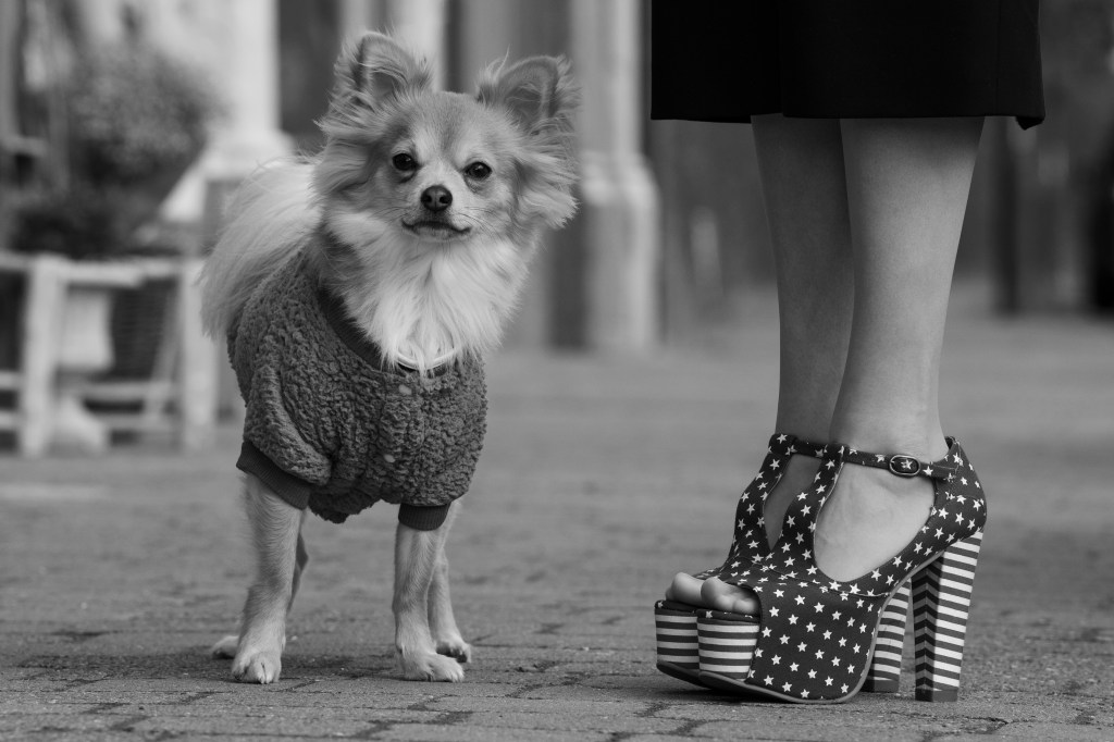 My approach to this image was to take a portrait of the dog (called Togo), with the same or similar conventions from the original image. The first difference is that I shot this picture while lying the ground and attempting to frame them in the same way. Togo is taller than original chihuahua but shares the relative scale that the breed is known for. His direct gaze, alert expression and stance are all similar with the exception of the panting – this image is defintely all about him. His coat when considered with the glamorous shoes suggests a cherished pet as in the original. The location is a street similar but much smaller than the original, so the scale isn’t as clear. To shift the establishment of location I included the context of the Stars and Stripes details on the shoes. Finally, the high heels and below-the-knee skirt emphasises Togo’s size in a similar way to the original image. However, it’s clear that the dog in Erwitt’s picture is smaller and stood a little behind his owner, which makes that difference much more impactful. I made the image black and white because I didn’t feel that including colour (dominated by the shoes) really added to the aesthetic and made it further from a recreation of the original picture.
