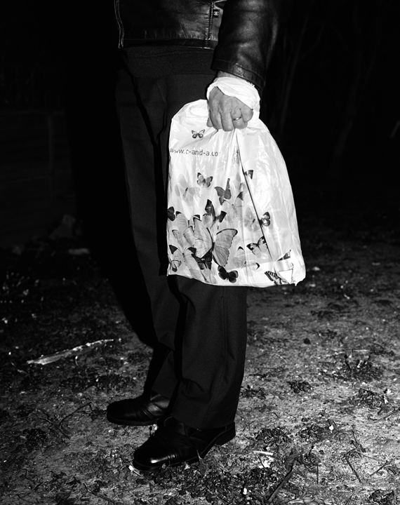 Here we have a portrait where Strand has dispensed with the studio background and instead shot in a natural environment. The man is standing in what looks like a gravel or well-trodden pathway where the only signs of vegetation are trampled sticks. The hint of the rural is overwhelmed by the smart, city attire of the man which makes him look like he’s not out hiking in the country. The inclusion of a small part of the informal jacket raises questions about who this person is in the context of this composition. Strand further includes a carrier bag decorated with butterflies which adds a contrasting element to the image. The butterflies juxtaposed with the bag, which looks like it’s made of plastic, points to the conflict of the natural world vs. the city. This work and the others in the series mixes the ideas of studio and street photography as the composition has both a sense of being ‘captured’ and lit by artificial light (the flash reflections in the shoes). When paired with Gone Astray Portraits. it’s clear that Strand is not being governed by a particular style and almost challenges us to question what is going on, both aesthetically and from a visual perspective.