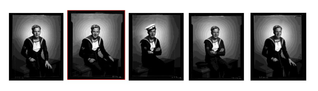 In his paper about a project he undertook with Edward Chambré Hardman’s archive of portraits that we have already discussed, Keith Roberts discusses the Hirsch’s concept of Postmemory alongside Svetlana Boym’s ‘The Future of Nostalgia”, first published in 2001. Boym takes the idea of nostalgia and breaks it into two forms, restorative and reflective. The former is related to a memory either real or passed down via a direct connection. For example I have a reflective memory of my late mother in the context of events such as decorating the Christmas tree in the photograph above, even though I cannot remember that precise occasion. A restorative memory would be more about the lives of my family during that period and the time that has passed since, with details contextualised in everything from the Western notion of ‘family’ to the Christian celebration of Christmas and all the traditions that go with it. For Robert’s project, he was using the groups of portraits of WW2 servicemen and women in Hardmans’ archive to explore the creation of Postmemory and the two forms of nostalgia within an exhibition of carefully selected images. The paper introduces the project but doesn’t discuss the outcomes beyond an interesting case study that emphasises the use of ‘gaze’. In his study of 5 images of a naval serviceman called Billy Walker, Roberts was able to first identify the image that Hardman had selected that best represented Billy (shown below with the red border). Secondly, he considered that image within the complete set.