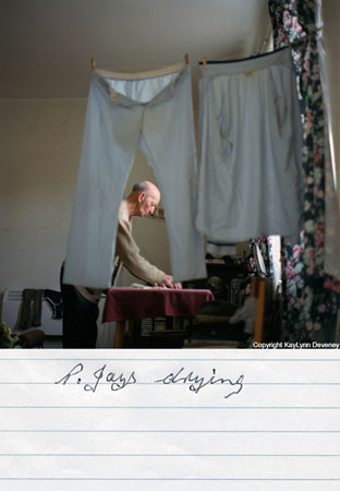 The next two artists we are introduced to have both made use of annotation in their works. Kaylynn Deveney’s series “The Day-to-Day Life of Albert Hastings” is just that. The artist got to know her subject, an elderly gentleman that lived in the same area of South Wales, and photographed him going about his day. While we have encountered a number of artists who have done this sort of thing, what is interesting about Deveney series is that it is annotated by the subject. In her introduction to the series, Deveney describes how she wanted to explore Albert’s experience of being photographed and how it differed from how she perceived him as a subject. When we look at the annotations that he added, we get an insight into his personality that supports the image. Some are banal, which is how Deveney describes the particular event being photographed, for example:
