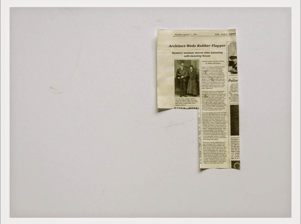 This narrative series by Colvin is the subject of an interview that he gave with OCA, where he describes how his ideas for narratives came about. The basis for the series comes from the refusal of Staten Island Officials in New York to acknowledge the sexuality and relationship of 19th Century photographer Alice Austen. Austen and Gertrude Tate lived together as ‘companions’ and partners in the tea room they ran in Clear Comfort, NY. The extent of their relationship was both hidden from and denied by the women’s families to the extent that their final wishes to be buried together was ignored. Colvin related to the denial of gay sexuality and used the further historical control of Austen’s estate, principally the refusal to allow research of her archive of work at the time of his assignment, to create a fictional documentary of a secretive woman who lived in a self-cleaning house. The narrative that the series creates a sense of observing the bizarre, sympathetically trying to uncover the ‘truth’ of the character’s life and a sense of unwanted intrusion when he makes progress with this quest. We have a combination of words and text that make the character come to life as Colvin places himself in the role of investigator. Colvin’s use of text is interesting here because he combines a related event with complete works of fiction. In the example below, we see what looks like a real newspaper cutting about an mysterious woman and her new husband living in a self-cleaning house. It’s based on Colvin’s discovery that someone did build such a house and lived in it for many years, but the cutting is a prop created by the artist. He includes it as a sort of scrapbook image with a more readable transcript telling some of the Flapper’s story to the viewer.